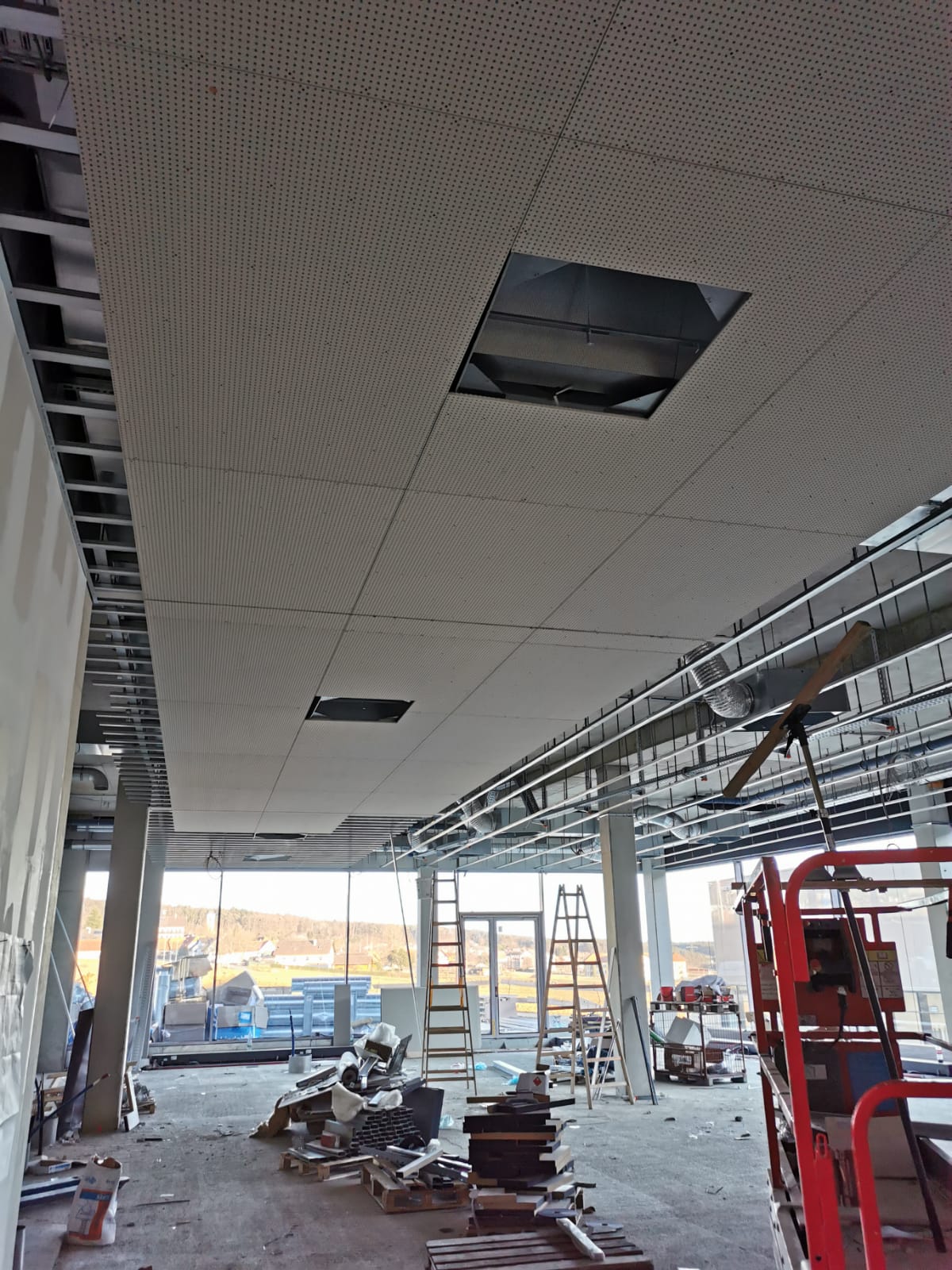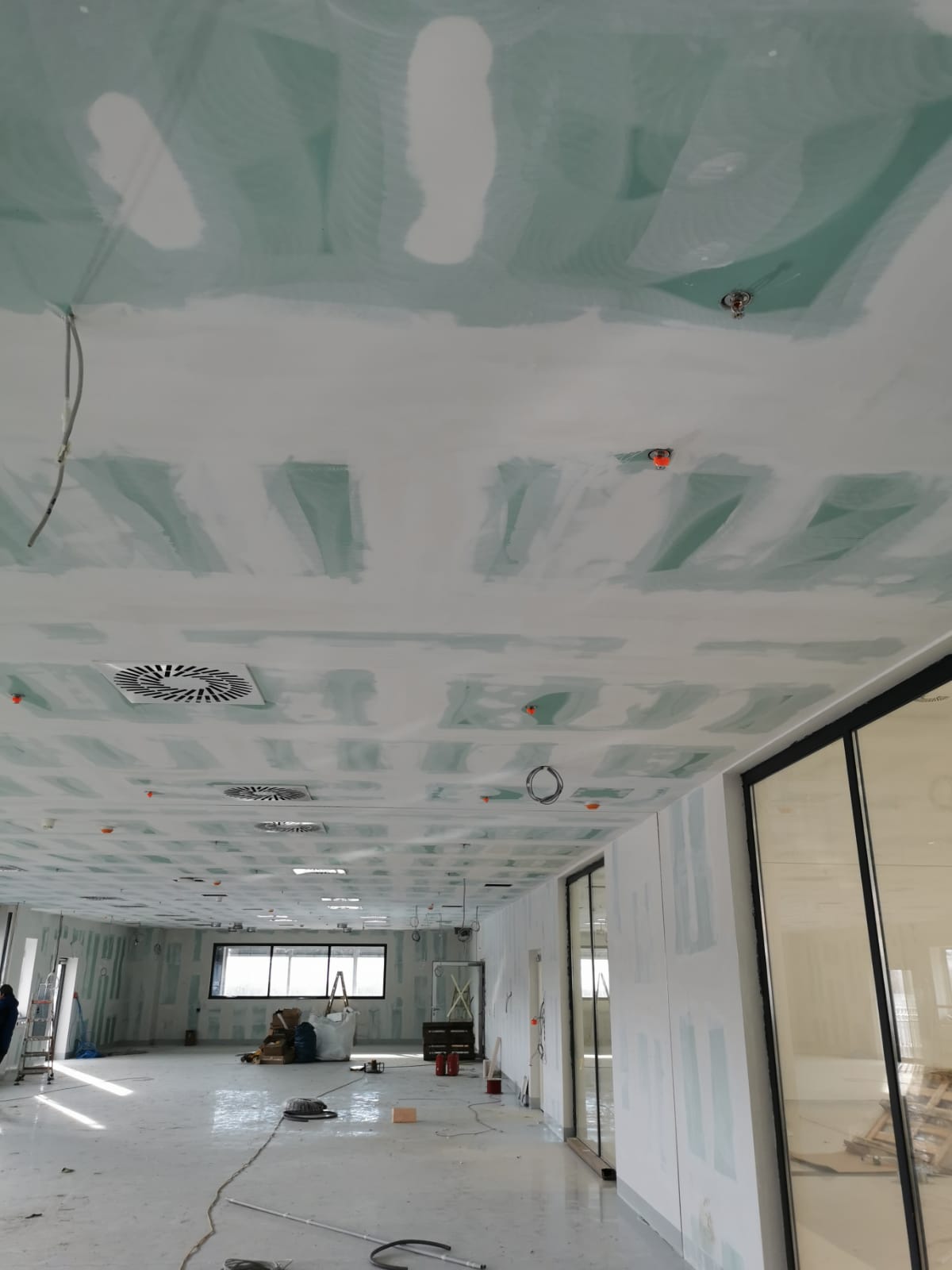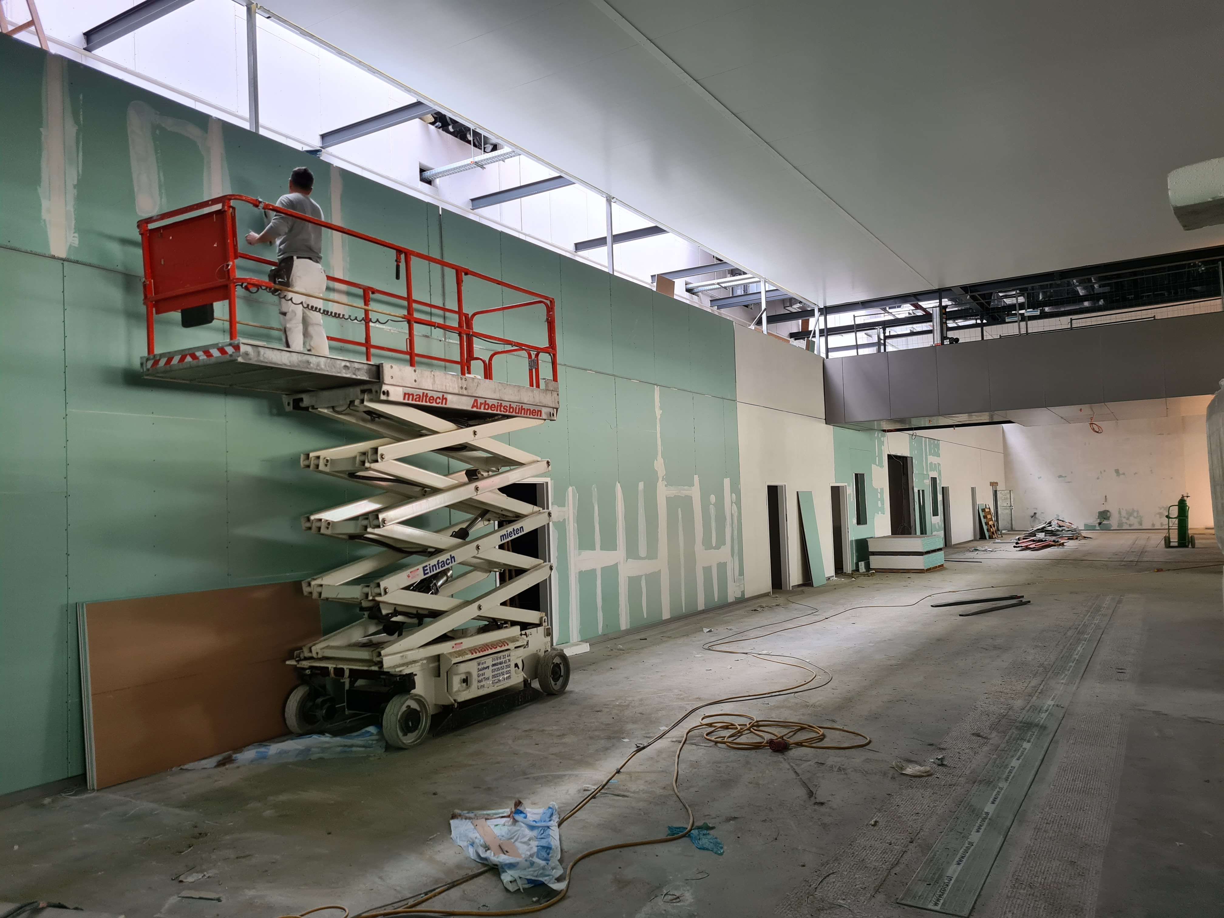 Ausgeführt wurden die Trockenbauarbeiten in den Produktions-, Reinraum- und Bürobereichen. In der Produktion und in den Reinräumen wurden besondere Anforderungen an die Verarbeitung gesetzt, um die hygienischen Anforderungen zu erfüllen. Der Ausbau der Büroräumlichkeiten erfolgte allem voran mit den Anforderungen der Raumakustik, welche mit Gipskarton Lochdecken hergestellt wurden.